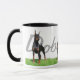 Três Pinschers pretos do Doberman com o envoltório gráfico do nome da raça em torno desta caneca projetam.