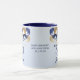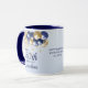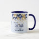 A stylish 50th birthday mug . Design features navy blue and gold balloons, Gold glittery starts and navy blue text all on a pale blue gradient background. A lovely gift for a 50th birthday party celebration. Easy to customize with your own details.