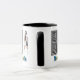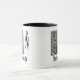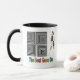 Branco e preto 11 oz. Ringer combo mug com uma imagem, de ambos os lados, de cinzas e arte Op preta, uma fêmea vestida de modo preto e branco de Mod, e o sentimento "The Beat Goes On" em letras arco-íris. Ver frasco correspondente, porta copos e vidro. Veja toda a coleção Disco 70s Mug na COMIDA/BEV| Seção Pratos.