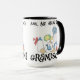 Uma cegonha senta-se entre alguns brinquedos que incluem uma bola e o carro e o texto preto lêem "perguntam-me sobre meu neto!" nesta caneca bonito que é uma grande lembrança para a avó ou o vovô quando o neto novo for nascido!