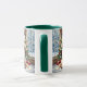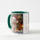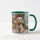 An adorable personalized Christmas coffee mug with a festive poodle sitting in front of the fireplace on a cold winter day. A Christmas tree decorated and a festive background.