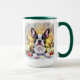 An adorable Boston Terrier dog sitting in illuminated Christmas lights seasonal festive coffee mug.