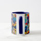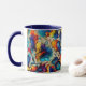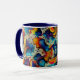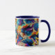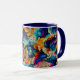 Esta é uma abstração colorida azul, violeta, vermelha, amarela, laranja, preta e ciano em tinta líquida sobre fundo bege claro.