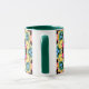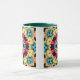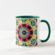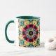Uma caneca alegre com padrões geométricos intrincados formando uma flor amarela brilhante.