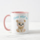Cute porcelain teddy bear with “Please adopt me” text on mug.