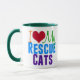 Um presente bonito para um dono que adora resgatar felinos doces do abrigo e dar-lhes uma casa amorosa. I Heart My Rescue Cats é escrito em laranja, vermelho, verde, azul e roxo por uma caneca colorida e divertida para um amante do gatinho.