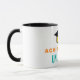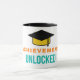 Um design de caneca ousado e comemorativo com "ACHIEVEMENT" em laranja e "UNLOCKED!" em tom de fundo branco. Um clássico boné de formatura preto com banda amarela e tala fica acima do texto, simbolizando a conclusão bem-sucedida dos estudos.