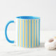Bonita Alice no País das Maravilhas, canecas personalizadas para uma festa de aniversário do tema do livro. A menina Alice no vestido azul e o Mad Hatter sentam-se em bonito listras amarelas azuis. Personalize esta decoração do partido com o seu próprio texto.