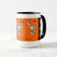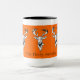 A caneca moderna à moda do estilo country que caracteriza a cabeça e os antlers brancos de três cervos em um fundo alaranjado com as listras laterais pretas decoradas com o Edelweiss alpino branco floresce. Ideia bonita do presente para o Natal ou a alguma outra ocasião. Um presente bonito para seus amigos, família
