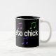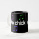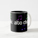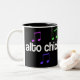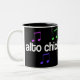 O design do pintinho do alto tem notas coloridas da música e o slogan do alto do divertimento vem em uma caneca alta com fundo preto.