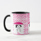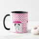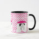 Caneca fofa com menino e menina doodle segurando guarda-chuva, sob chuva de coração rosa.