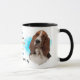 Um retrato de um Cachorro de Caça Basset compulsivo é a característica em dois lados desta caneca. Cada imagem é colocada sobre um fundo azul brilhante de filtro. Entre as duas imagens está o texto que descreve esse companheiro leal e amoroso, com "o cachorro BASSET HOUND" em preto no fundo. Todo o texto é facilmente personalizado para qualquer coisa que você queira para que você possa descrever seu próprio amigo leal.