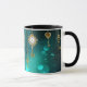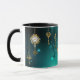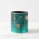 Gold, antique keys with gears and dials hang on gold chains on luminous green background.