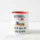 Cena de praia com areia, guarda-chuva de praia, e bola de praia: "Aposentado... Vês-te na praia", caneca de café.