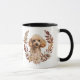 Uma bonito coroa de outono em tons de canela marrom, bronzeada e creme rodeia a imagem aquosa de um adorável cãozinho de Poodle. A imagem é impressa duas vezes na caneca, com seu texto personalizado entre eles.