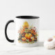Caneca de café com uma ilustração aquosa de uma paisagem de outono no fundo com abóboras e flores de queda no primeiro plano. Várias cores de borda e identificador para escolher e estilos e tamanhos adicionais disponíveis.