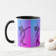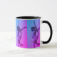 Uma imagem repetida colorida, azul e roxa, de um macaco-aranha juvenil numa caneca de café com um cabo preto e dentro contrastante. Imagem tirada de um desenho original do meu macaco-aranha.