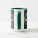 Uma bela imagem de um azulejo Art Nouveau em verde-escuro, ouro e branco. Flores bonito, brancas e verdes, em forma de ventoinha, cinzas e vinhas douradas.