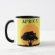 Caneca de café na silhueta de uma acácia africana contra um pôr do sol estilizado de laranja e amarelo