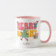 Imagem de tipografia de ranhura retrorativa personalizável caneca de café. A design apresenta o texto "Feliz Brilhante" em tipografia de groovy rosa e amarela com elementos temáticos kawai como a árvore de Natal, papais noeis coloridos e estrelas. O nome pode ser facilmente personalizado. Faz o melhor presente personalizado para você, seus amigos, familiares e até mesmo vizinhos. Temos mais de 45 designs de Natal em temas retrorados, aquarela e tipografia engraçada em nossa coleção que vocês definitivamente amarão. Feliz Natal!