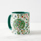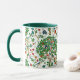 Caneca de café em uma tomada de Nouveau da arte de William Morris "árvore em um teste padrão tradicional da vida", caracterizando as árvores da fantasia cercadas pelos ramos enchidos com as flores exóticas e os pássaros, máscaras do verde esmeralda, tan, ouro, vermelho, e azul de turquesa, em um fundo branco