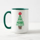 Esta caneca fofa apresenta uma árvore de Natal festiva com a palavra paz e inicial personalizável em estrela vermelha.