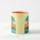 Esta caneca colorida de café da praia tem um aspecto retrô com um design gráfico estilizado de palmeiras curvas e emolduradas contra um arco de pôr do sol e cores do céu em listras de chalé popular, ouro, laranja e vermelho. As palmeiras se põem sobre madeira de praia em apuros, com cartaz de praia e chinelos na frente. As iniciais do seu monograma aparecem em uma cor dourada, portanto, certifique-se de editar os espaços reservados na seção Personalizada. O fundo da caneca - tudo exceto a área da alça - está em amarelo pálido, e a opção mostrada aqui inclui um dentro de píxula e píxula cor laranja escura. Outras opções de caneca e caneca de cerveja estão disponíveis.