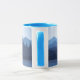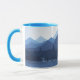 Silhuetas de montanha e reflexões em tons de azul, com texto personalizável. O texto de amostra baseia-se numa citação do naturalista John Muir e pode ser alterado ou suprimido.
