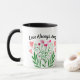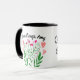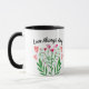 Para trás da caneca tem o buquê colorido da flor da aguarela nos rosa e nos verdes com placeholder acima para sua própria mensagem.