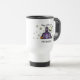 Uma caneca do Dia das Bruxas para os professores que caracterizam uma ilustração de um roxo "assombrou a escola" cercada por estrelas e por uma Lua cheia.  A escola tem uma lanterna do jaque o, um gato preto, uns spiderwebs, e uns bastões.  O texto superior lê "o Dia das Bruxas feliz!"  Personalize com seu nome no fundo.