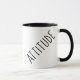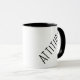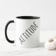ATITUDE escrita em negrito, preto, fonte moderna escrita diagonalmente na face e no verso e nesta caneca. Este design está disponível em muitas cores e estilos.