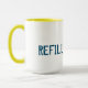 Largura gráfica amarela sobrescrita com o texto azul escuro "REPREENCHER OBRIGATÓRIO". A declaração refere-se à caneca que necessita de recarga, ou à pessoa que a detém que necessita de atenção - política, pessoal ou emocional. A queda vem em várias cores, destinada a uma grande variedade de necessidades relacionadas a cores.