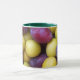 Caneca branca com manípulo e jante verdes escuros, decorada com uma fotografia de frutas de outono.