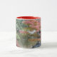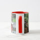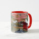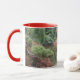 Aproveite sua bebida quente ou fria favorita nesta caneca de café que apresenta uma foto de enrolar de uma cena de lago de jardim japonês no outono mostrando folhas de maple vermelho e um santuário Shinto vermelho e miniatura. Selecione o estilo e a cor da caneca conforme desejado. Foto: Point Defiance Park Jardim Japonês