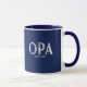 Design de caneca de café Opa com ano de fundação apresentando uma fonte branca estampada em um fundo Azul Marinho. Clique em personalizar para editar a cor do fundo!. Visite nossa loja para ver esta caneca em uma grande variedade de nomes de avô.