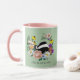 Um texugo preto e branco giro sentado entre flores e cogumelos selvagens num pano de fundo verde-sábio