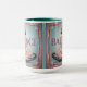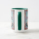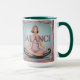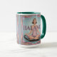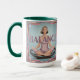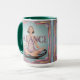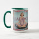 This Art Deco Mug features a stylized illustration of a woman meditating in a lotus position on a curved brown platform on a turquoise background. The woman is wearing a light pink sleeveless top and has wavy light brown hair. Her eyes are closed in a peaceful expression, and her hands are positioned in meditation mudras. The word BALANCE appears in purple letters in the center of the image. The illustration is framed by an Art Deco-style border with geometric patterns in pink, purple and gold tones. The border features angular shapes and decorative corner elements that create a symmetrical, ornate frame. The mug has the image on both sides of the mug. The mug is a combo mug with a green handle and a hunter green interior glaze.