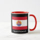 A bandeira de Polinésia francesa foi adotada em 1984. Duas bandas horizontais vermelhas encerram uma banda branca larga em um 1:2: 1 relação; é centrado na banda branca um disco com um teste padrão de onda azul e branco que descrevem o mar na metade inferior e um teste padrão do ouro e o branco do raio que descreve o sol na parte superior - metade; uma canoa polinésia monta no teste padrão de onda; a canoa tem um grupo de cinco representados por cinco estrelas que simbolizam os cinco grupos de ilha; o vermelho e o branco são cores polinésias tradicionais.