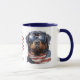 A característica desta caneca única é uma imagem aquosa de um cão Rottweiler embrulhado numa bandeira americana e vestindo óculos de sol. A imagem está em dois lados da caneca, com estrelas e listras e seu texto personalizado entre elas.