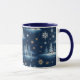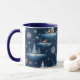 Mug em um padrão de neve com tema de feriado cobriu vergreens. cervo e flocos de neve espalhados em um fundo azul profundo da meia-noite