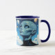 Ufologia - café personalizado. Uma bela alienígena extraterrestre fêmea com grandes olhos azuis olhando para o espaço nas estrelas e nos planetas.