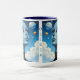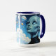 Ufologia - café personalizado. Uma bela alienígena extraterrestre fêmea com grandes olhos azuis olhando para o espaço nas estrelas e nos planetas.