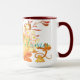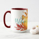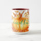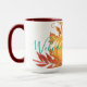 Bem-vindo ao outono com uma caneca de café decorada em uma abóbora, folhas e design de flores de outono. Uma abóbora amarela-ouro ilustrada fica entre folhas vermelhas e douradas e pequenas flores cor-de-rosa Aster. Um texto grande, azul-esverdeado na caneca diz, "Bem-vindo ao outono" e é personalizável. Mugs têm seleções de cores.