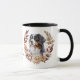 Uma bonito coroa de outono em tons de cinamão marrom, bronzeado e creme rodeia a imagem aquosa de um Cão de Montanha Bernês. A imagem é impressa duas vezes na caneca, com seu texto personalizado entre eles.