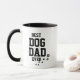 A black ceramic coffee mug with the text "Best Dog Dad Ever" and paw print designs.