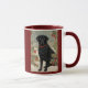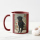 Um Labrador Retriever preto senta-se numa cena de inverno nevado, emoldurado por ramos sagrados com frutas vermelhas. O cachorro tem uma coleira vermelha e olha diretamente para o espectador com uma expressão calma e digna. O fundo apresenta uma floresta nevada com ramificações negras e uma paleta de cores suave e suave. A imagem evoca um sentido de tranquilidade e a beleza do inverno.