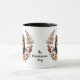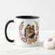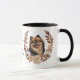 Uma bonito coroa de outono em tons de cinamão marrom, bronzeado e creme rodeia a imagem aquosa de um adorável cão Pomerano preto e vermelho. A imagem é impressa duas vezes na caneca, com seu texto personalizado entre eles.