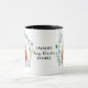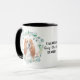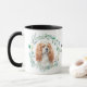 "CAVALIER KING CHARLES SPANIEL" é o texto no centro desta caneca. Cada lado da caneca tem um belo retrato de aquarela de um adorável Blenheim spaniel em uma coroa azul verde. Entre as duas imagens está o texto, que pode ser facilmente personalizado, ou mesmo removido, por você.