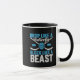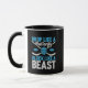 A caneca de Hockey Goalie com texto azul e branco, capacete com máscara, punhos e bastões de hóquei lê Largar como um Bloco de Borboleta Como uma Besta!