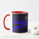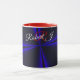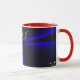 Enjoy your next cup of hot chocolate in this unique coffee mug. This geometric beauty features a trendy blue red color accented clover leaf theme design and personalized custom text.